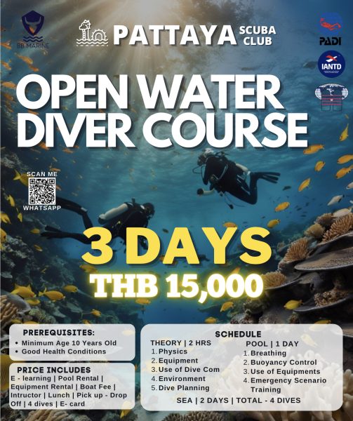 Day 2 – Open Water Training The next morning, you may travel independently, and we will meet at the meeting point at Bali Hai Pier, Pattaya., where the boat departs at 09:00am. At this point, the first dive will begin at 10:00am, followed by lunch and a short rest at 11:30am. Subsequently, the second dive starts at 13:00pm. Finally, we will return to the pier at 14:00pm and arrive back on shore around 15:00pm. This schedule ensures that every student in our entry-level scuba program experiences both excitement and relaxation at sea.